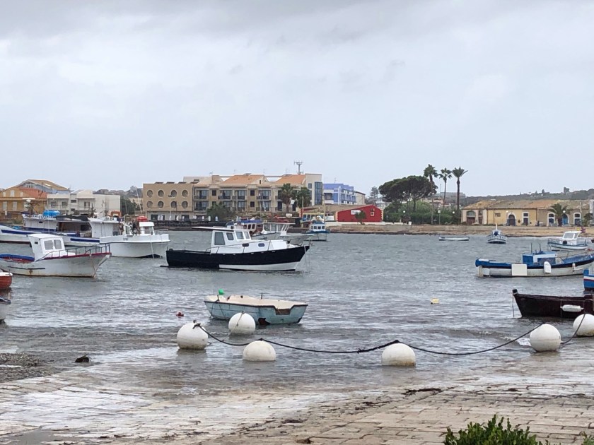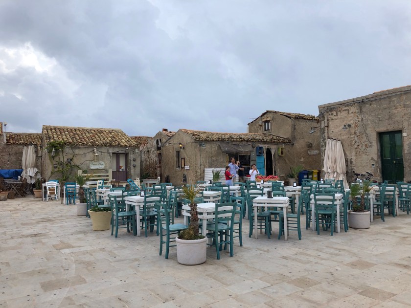 Next we drove to the fishing village of Marzamemi, once an important site of tuna fishing and procession the southeastern coast of Sicily. (The other area for tuna was on the northwest coast where the tuna had a higher fat content because they hadn’t yet gone out to breed/spawn.) The village no longer has a tuna processing plant and the modest homes of the fishermen have been converted to shops and restaurants. It was a blustery and overcast day and the village did not have many visitors nor were many of the shops open. We got caught in a brief cloudburst but luckily we brought umbrellas!