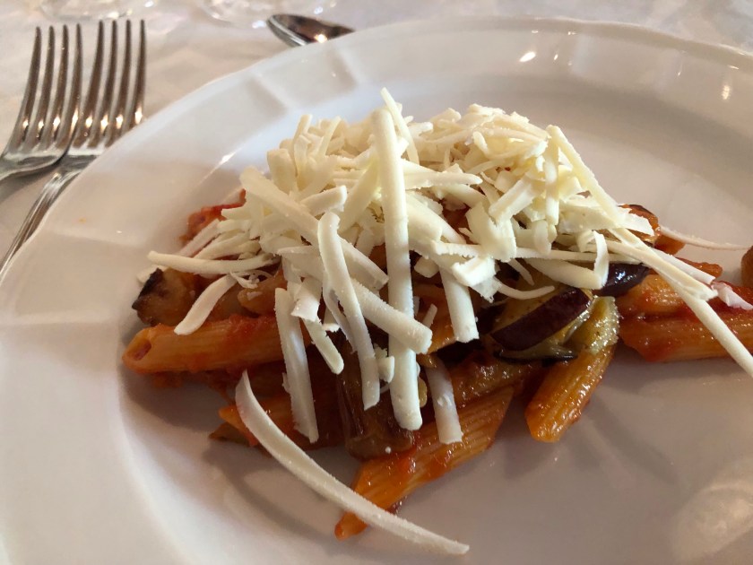 The next stop was a visit to the Zisola vineyard where we learned a bit about winemaking in the region. We had a vegetable- based lunch, with zucca (pumpkin), eggplant, onion frittata, cheeses, pasta alla Norma, olives, and a dessert made with grape must (leftover skins from the grape pressing. It had a gelatinous consistency and was not particularly sweet!