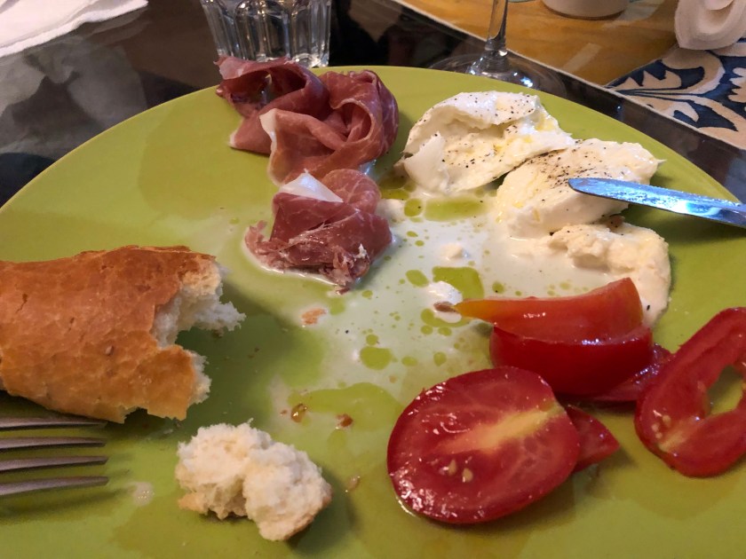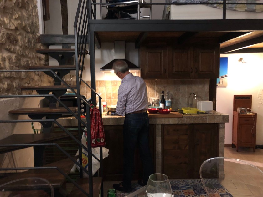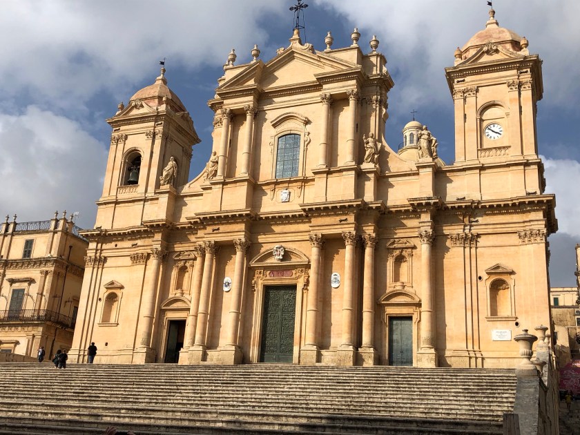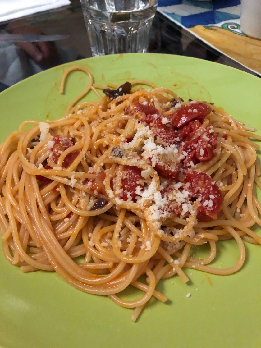 The last stop was in Noto, entirely rebuilt in a different location after the earthquake of 1693. The city has a golden yellow appearance due to the type of stone and the angle of the sun light hitting the buildings. The cathedral was recently rebuilt following the collapse of the dome in the 1980s. Many palazzi, some garishly adorned, are found throughout, many owned by families prominent in tuna fishing. We also stopped in at Caffè Sicilia, famous for their pastries. Still pretty full from lunch, we opted for a coffee granita instead. We returned to Ortigia around 6 pm and joined Christina (and Giuseppe) for a pasta dinner cooked by Giuseppe! After a delicious yet simple meal of spaghetti with tomato and olives, we spent the better part of two hours chatting away.