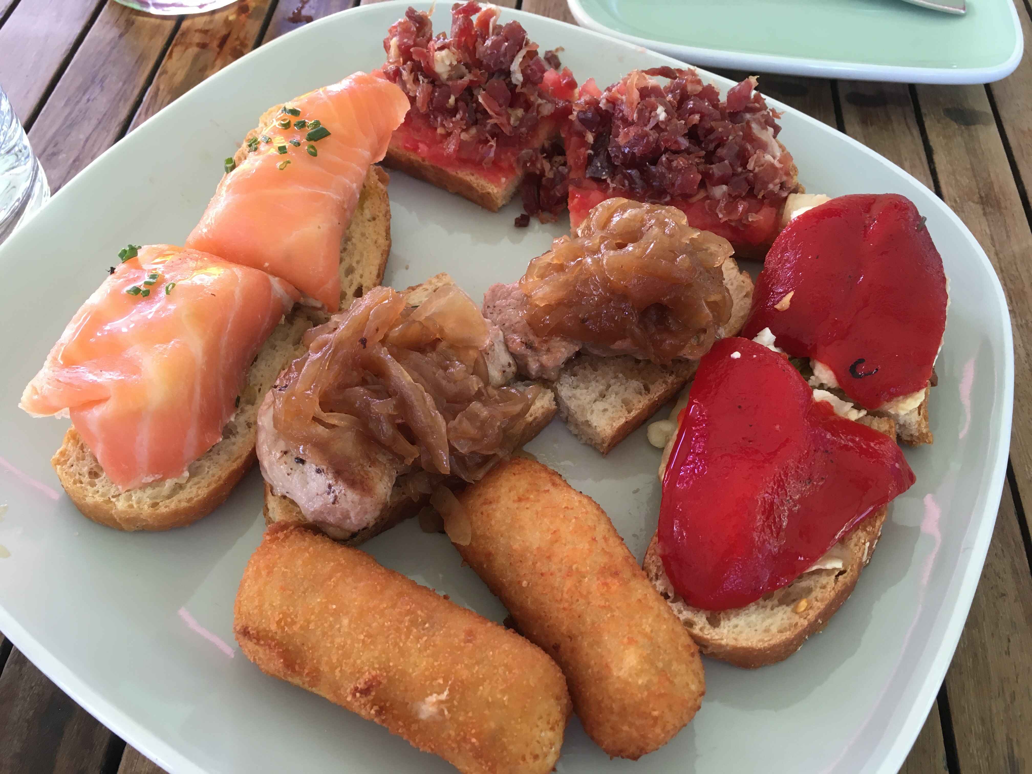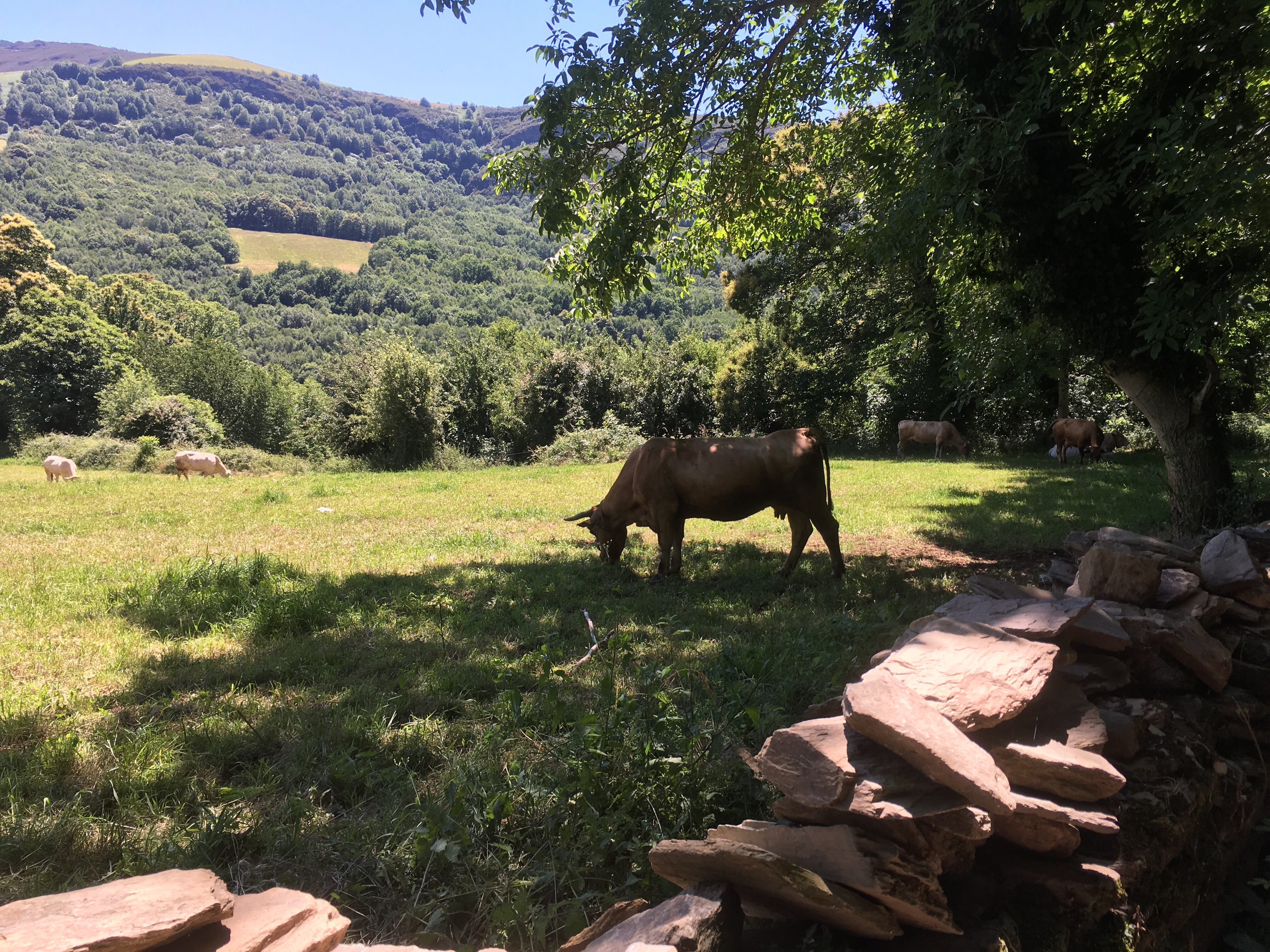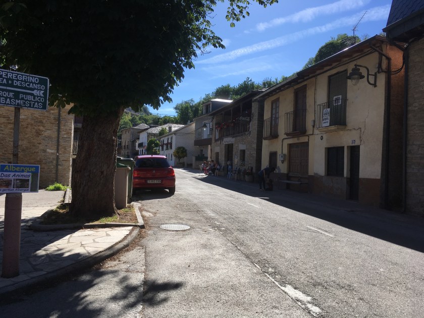 We stopped for a fourth refreshment stop a few km from our goal, Triacastela. Then we passed through fields where the Galician Rubio cows were grazing and saw an 800 year old chestnut tree. We finally reached Triacastela at 4:30 pm, hot and dehydrated, despite all the beer and water consumed. The town basically consists of one long (hot) street with a few bars, pensions, and the Complexo Xacobi, a combination pensione, albergue, laundromat, and restaurant, where we stayed the night. We had some tapas after we showered, and then bought some bandages at the farmacia. We weren’t hungry but did get a salad and a tortilla español for a light supper.