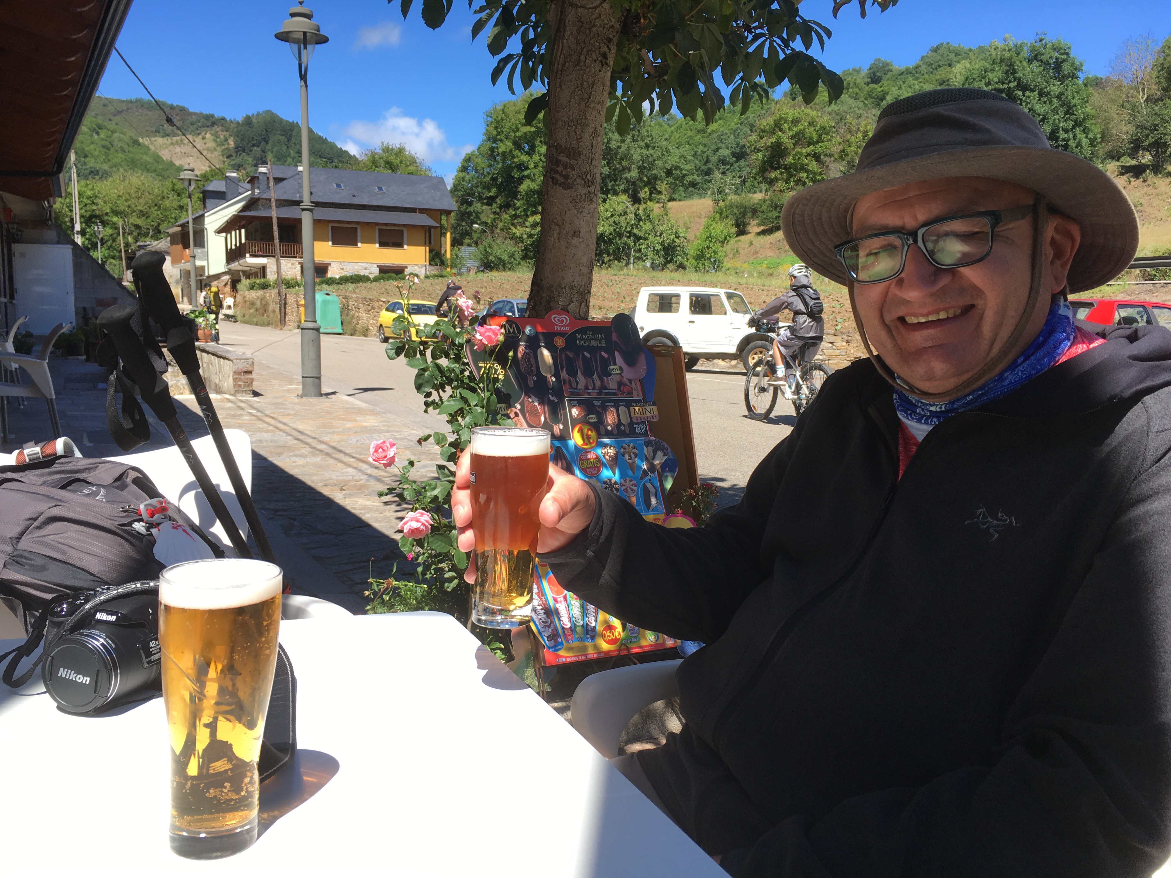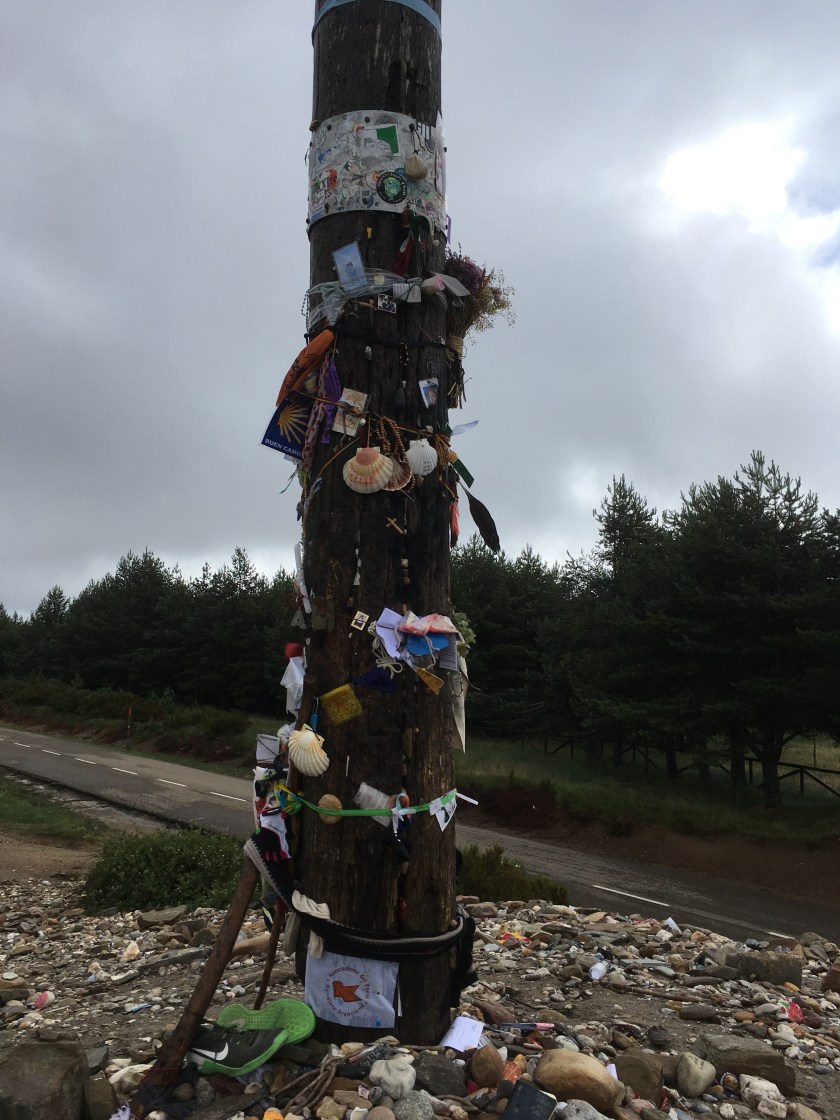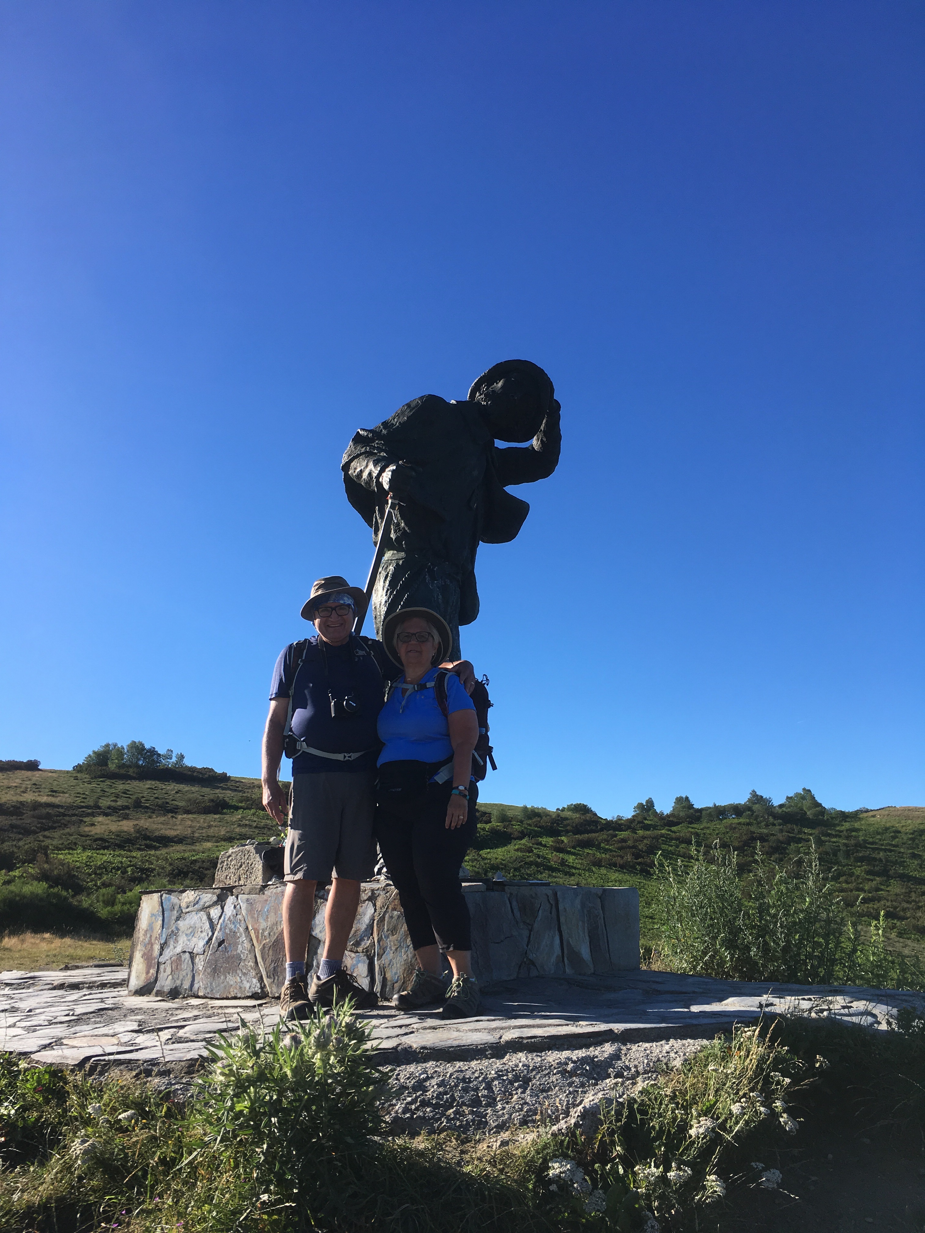 Next was an upward climb to Alto de San Roque, an iconic statue of a pilgrim struggling against the wind. Photo op time! Then a brief downhill hike and then the ridiculously difficult and steep and long uphill slog to Alto de Poio, at 1337 meters the highest point in Galicia. We needed to stop many times to rehydrate and reoxygenate! Of course, right at the top, there was a strategically placed bar where we consumed bocadillos of queso and of chorizo with 2 large beers, despite it being only 10:30 am! After chatting with two older women from New Zealand who had to stop their Camino in Leon due to injury, we continued downward. We walked through tiny hamlets, some of which consisted of only a house or two and stone barns, constantly dodging cow poop along the way. We stopped again in Fonfria for OJ and water and to scrape cow poop off my boots.