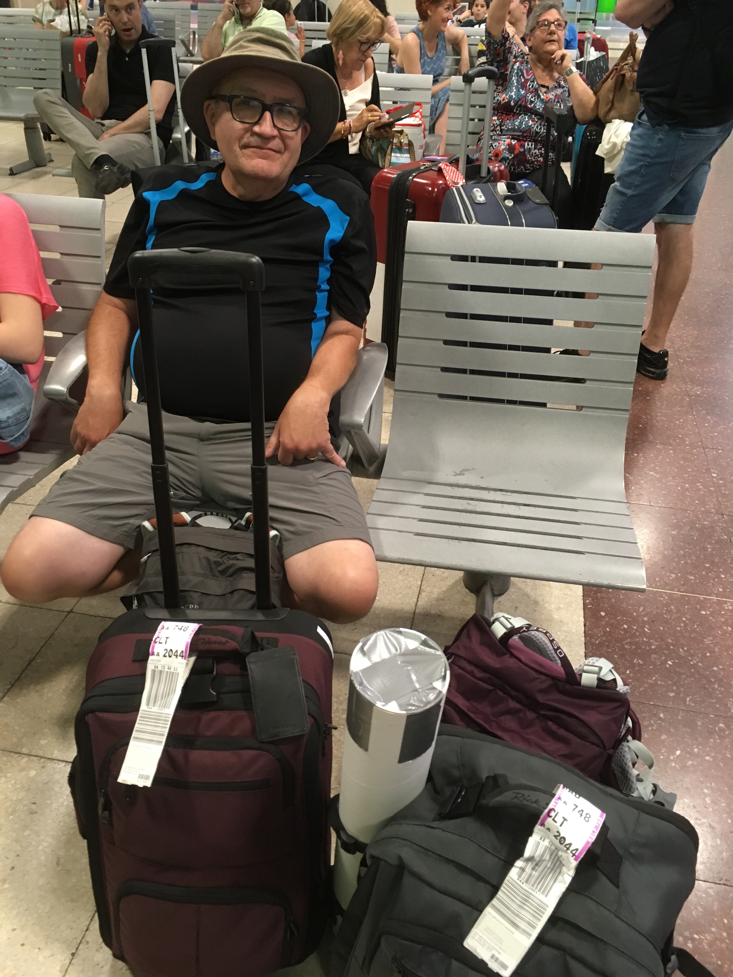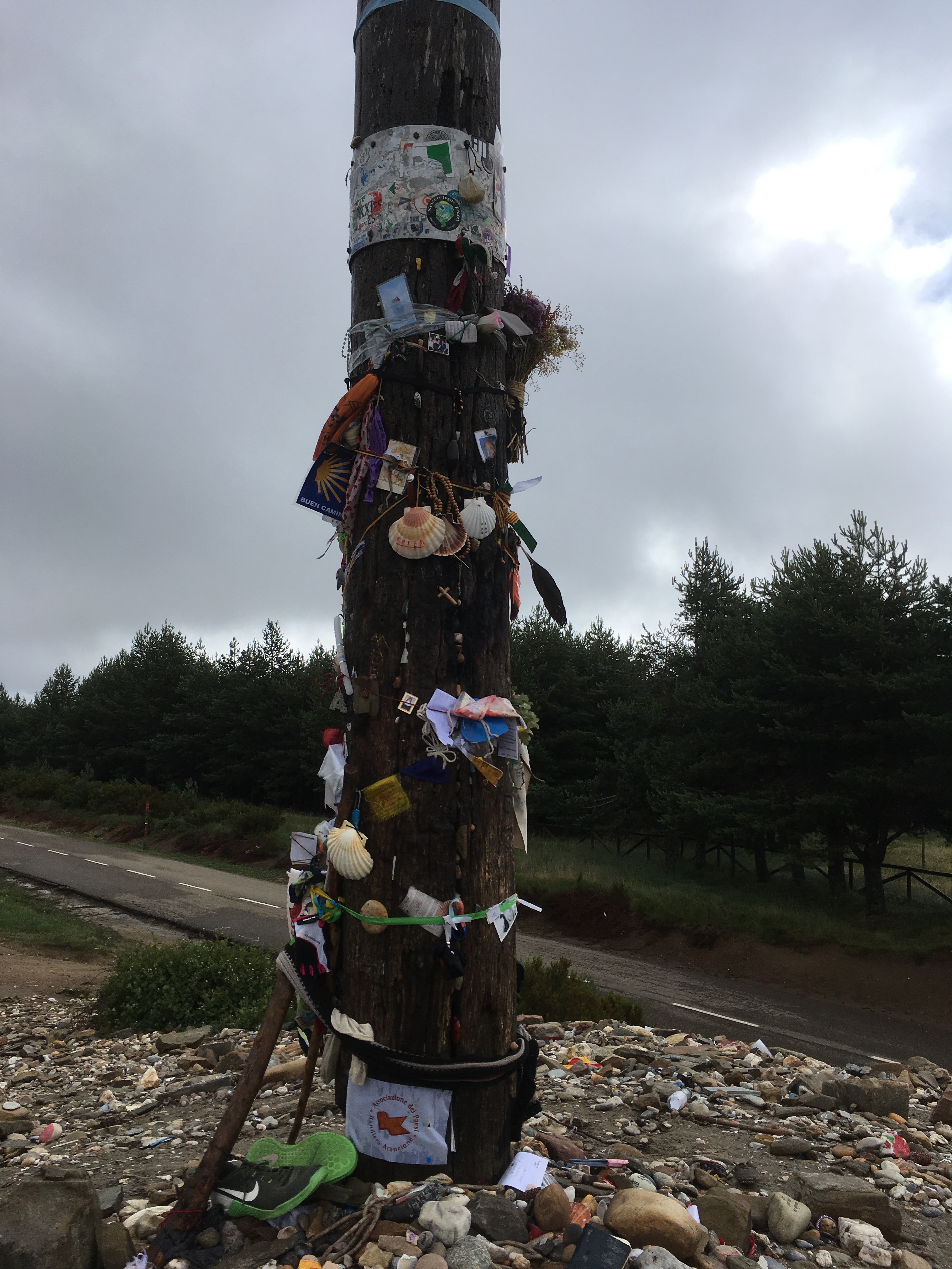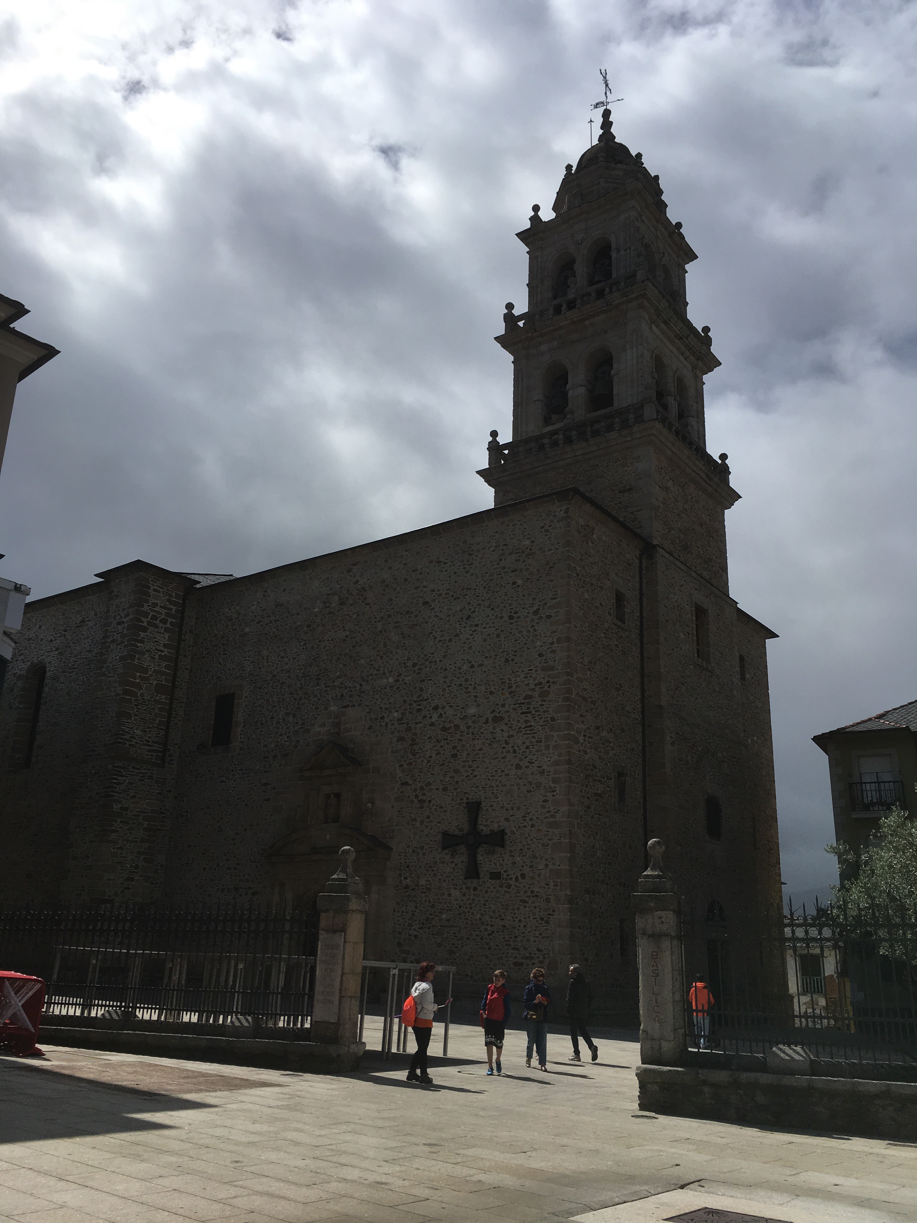 Next was an upward climb to Alto de San Roque, an iconic statue of a pilgrim struggling against the wind. Photo op time! Then a brief downhill hike and then the ridiculously difficult and steep and long uphill slog to Alto de Poio, at 1337 meters the highest point in Galicia. We needed to stop many times to rehydrate and reoxygenate! Of course, right at the top, there was a strategically placed bar where we consumed bocadillos of queso and of chorizo with 2 large beers, despite it being only 10:30 am! After chatting with two older women from New Zealand who had to stop their Camino in Leon due to injury, we continued downward. We walked through tiny hamlets, some of which consisted of only a house or two and stone barns, constantly dodging cow poop along the way. We stopped again in Fonfria for OJ and water and to scrape cow poop off my boots.