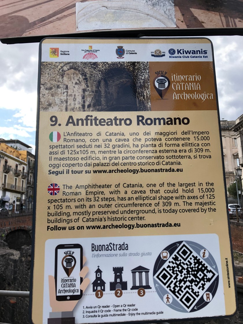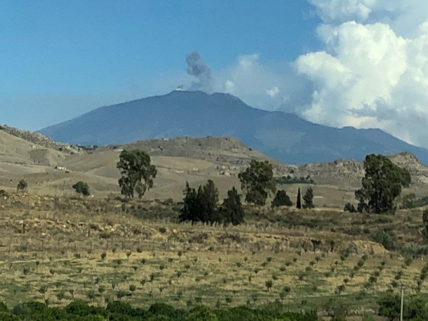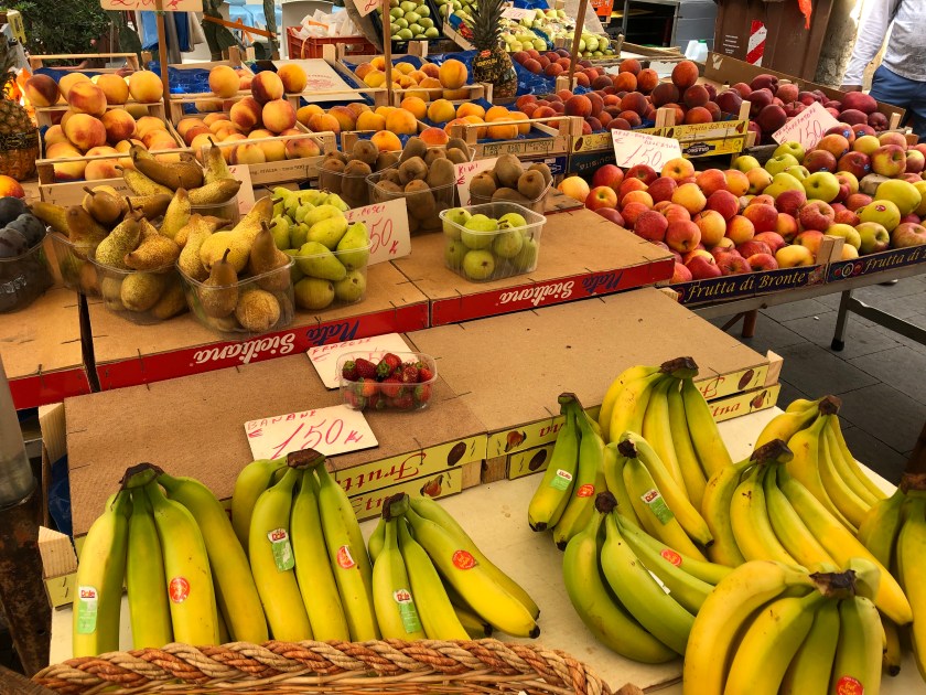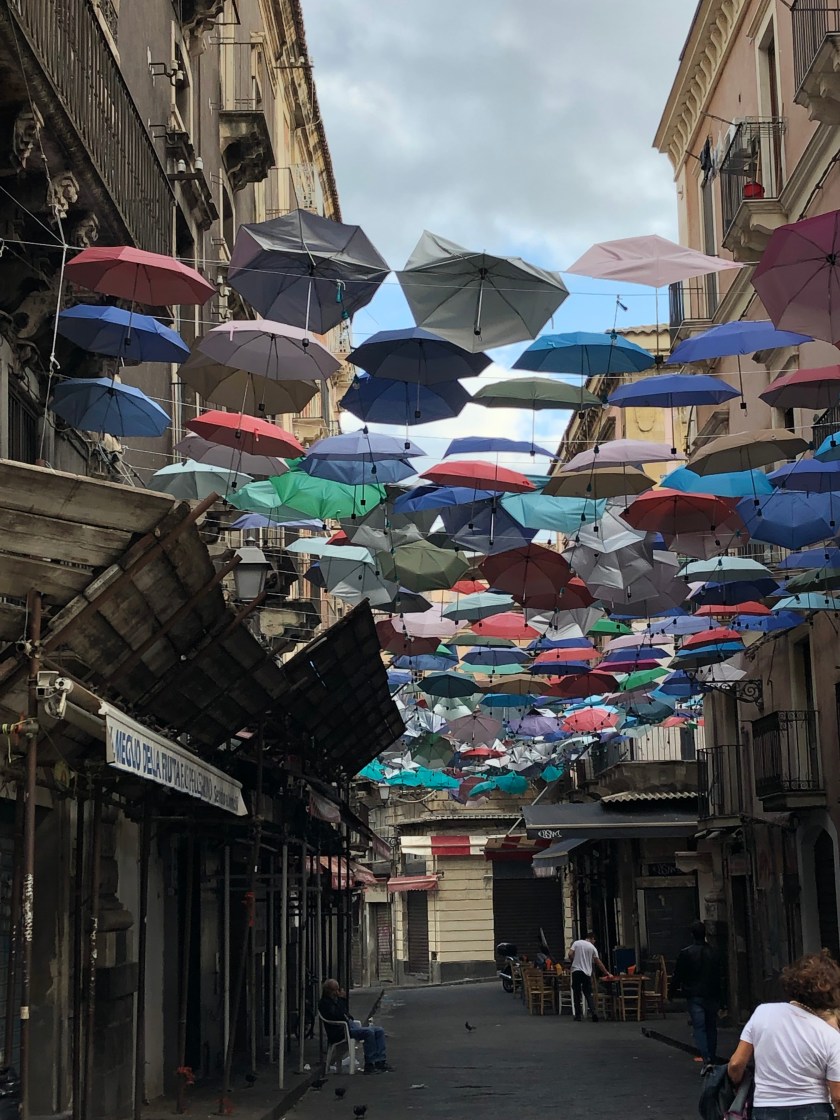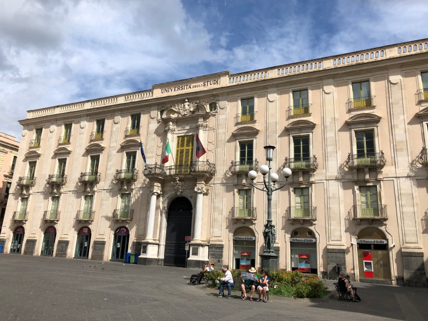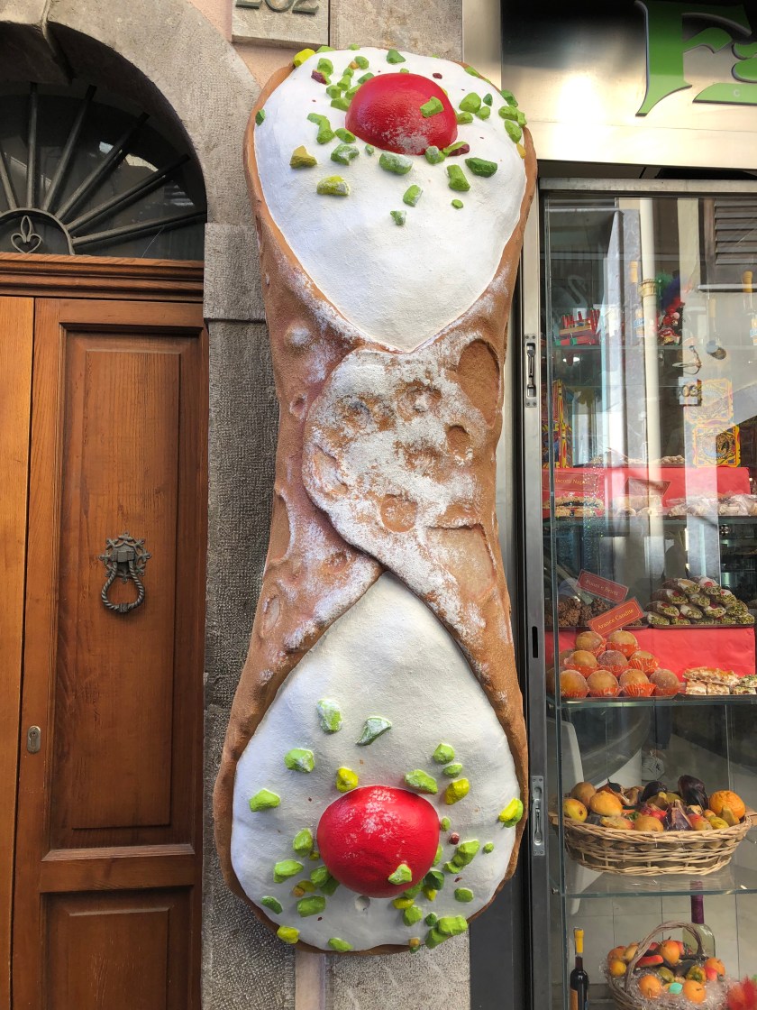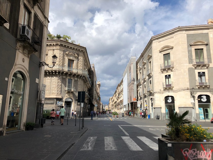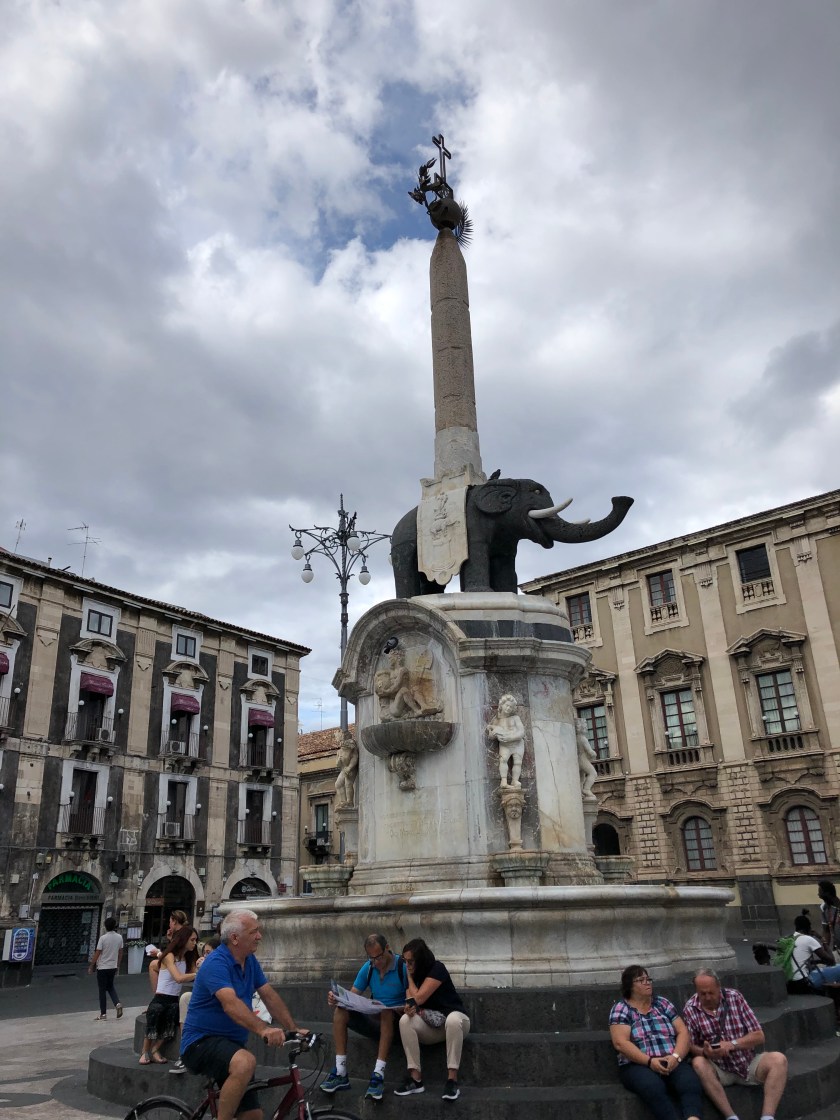After 21 days in Italy, today (Monday) is the first day with any appreciable rain! We did have about two hours of a rainstorm in Lecce, but we were under cover savoring an Aperol spritz and there was about a fifteen minute period of light drizzle one morning in Ortygia, but that really didn’t count as much as it didn’t impact our activity. Today’s forecast was for severe thunderstorms with possible flooding and hail so I was apprehensive that we would get through the day without getting drenched, but the rain held off until about 4 p.m., well after we completed our morning food tour in Catania. I booked the tour with Streaty, the same folks that run the food tour we took in Palermo. The morning was overcast and cool but warm enough to forego a jacket or sweater. We made the 15 minute walk down to Piazza Duomo (our meeting point) and ran into a demonstration- a large group of elementary school age children chanting and holding up signs. Apparently their school has been without electricity for several days and the local governmental authorities have not been responsive.