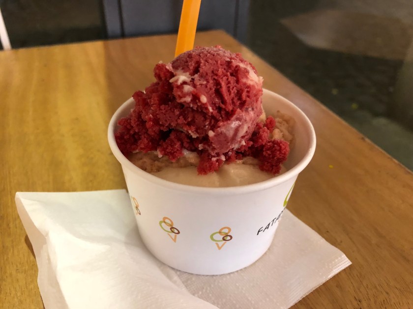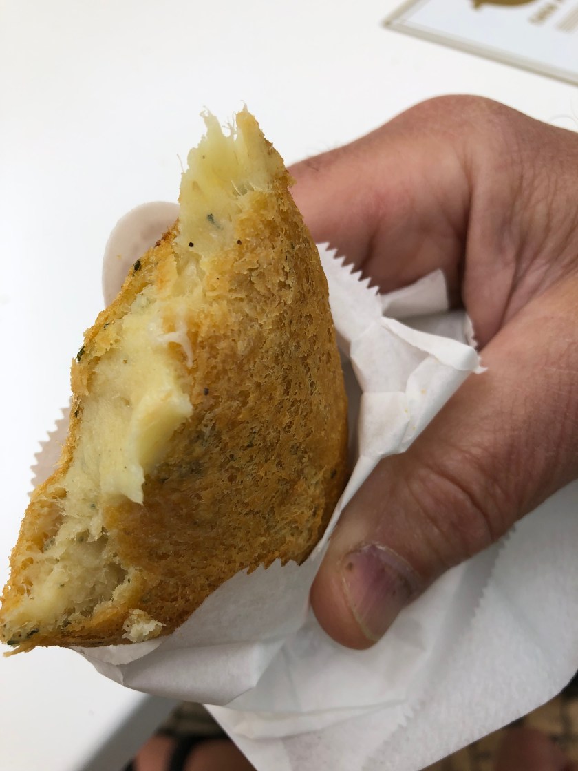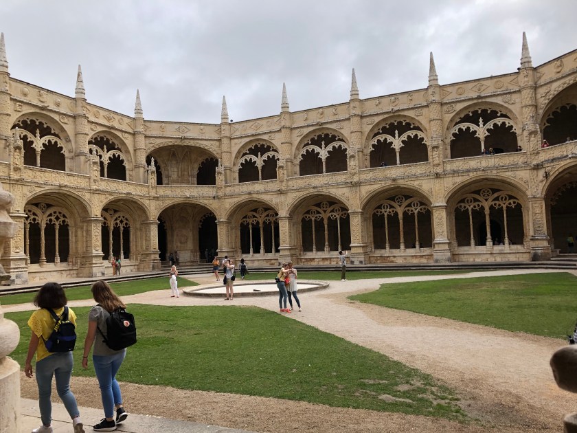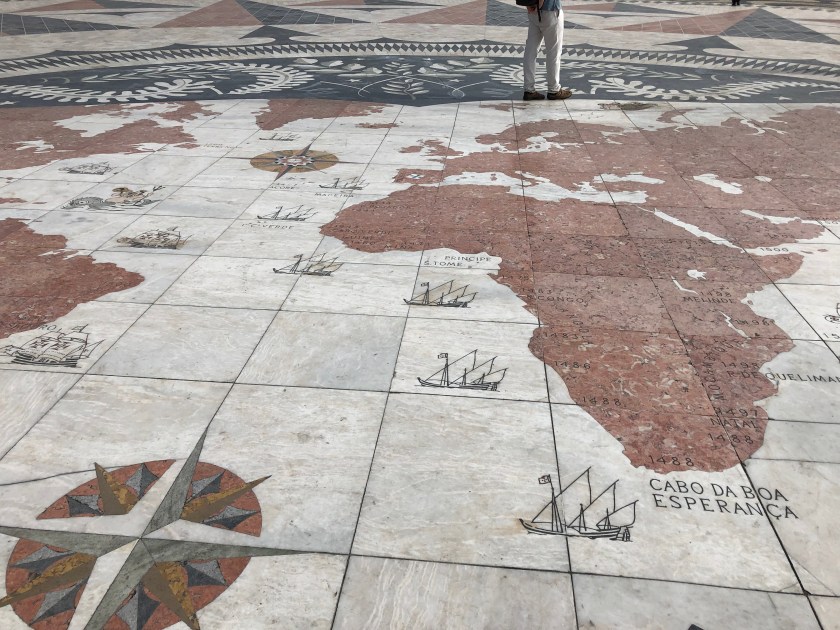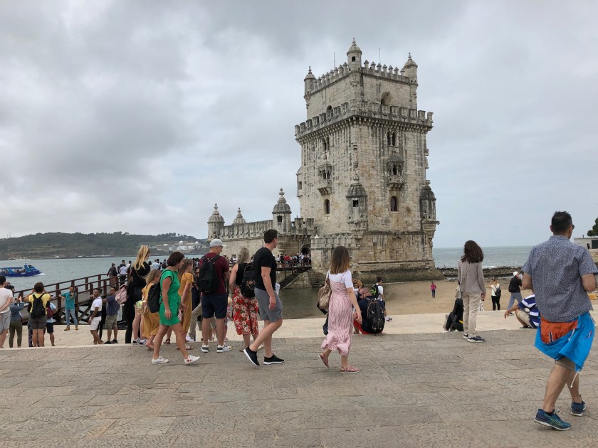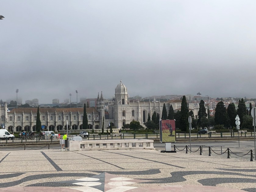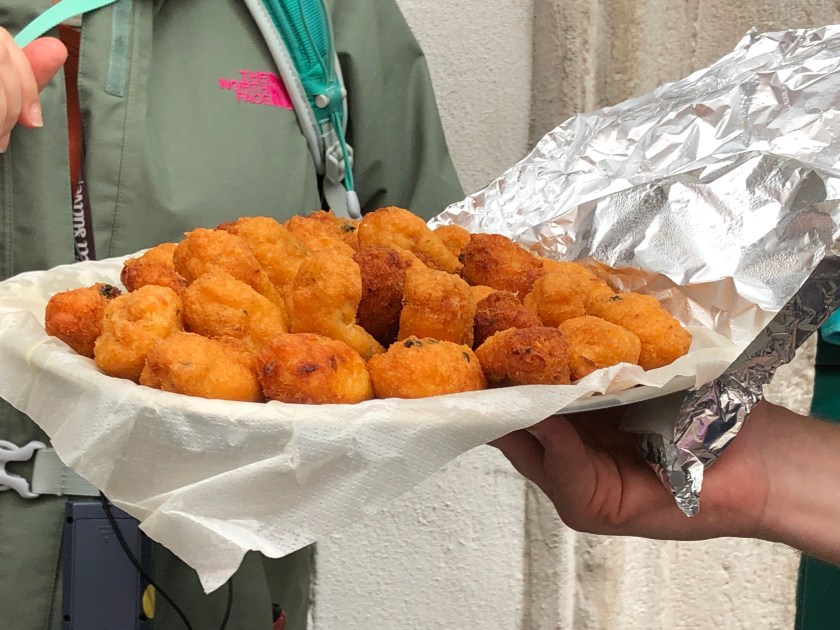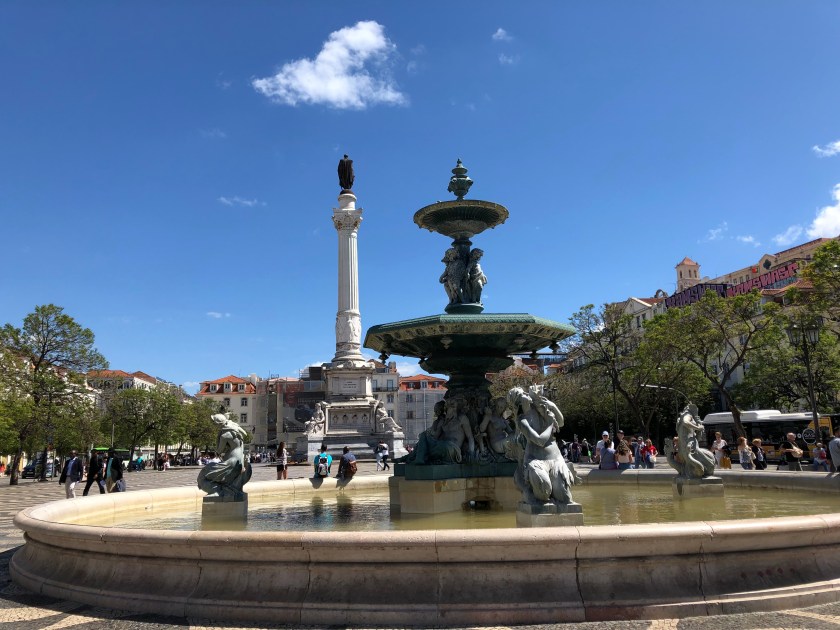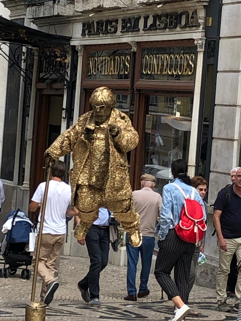 we disembarked near the Rossio train station. Tony was obsessed with sampling the bacalhau (salted codfish) and potato fritter and we still had about an hour before we could pick up our clean laundry. A pitstop at Starbucks (to use the rest room, one needs to purchase an item and then there is a restroom access code on the receipt) was necessary and then he got to try the “interesting” combination of fish, mashed potatoes, and gooey cheese!