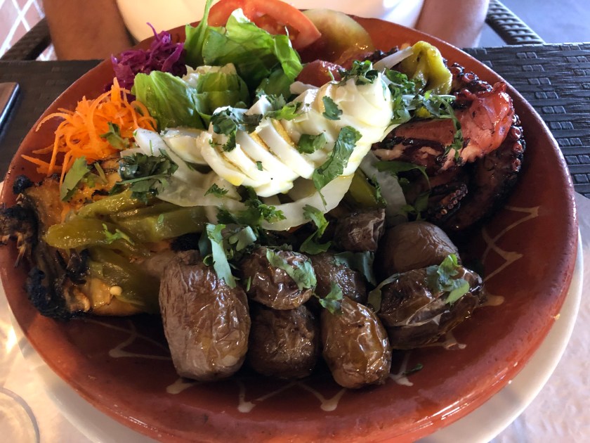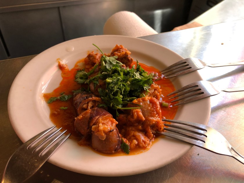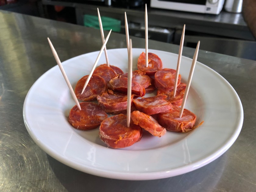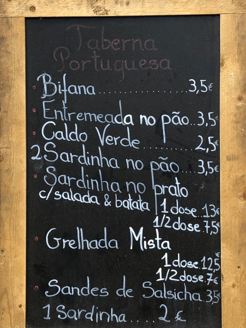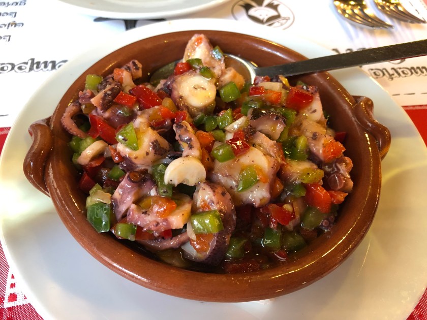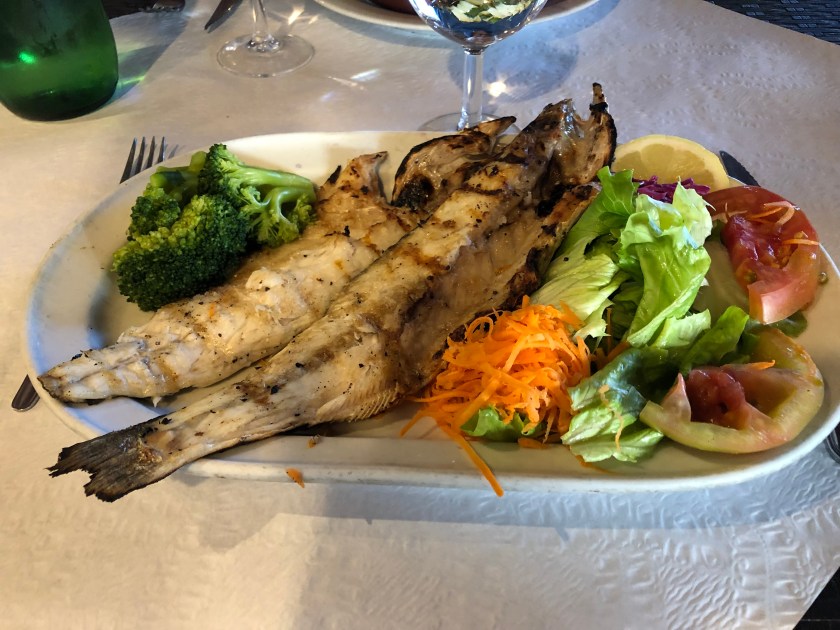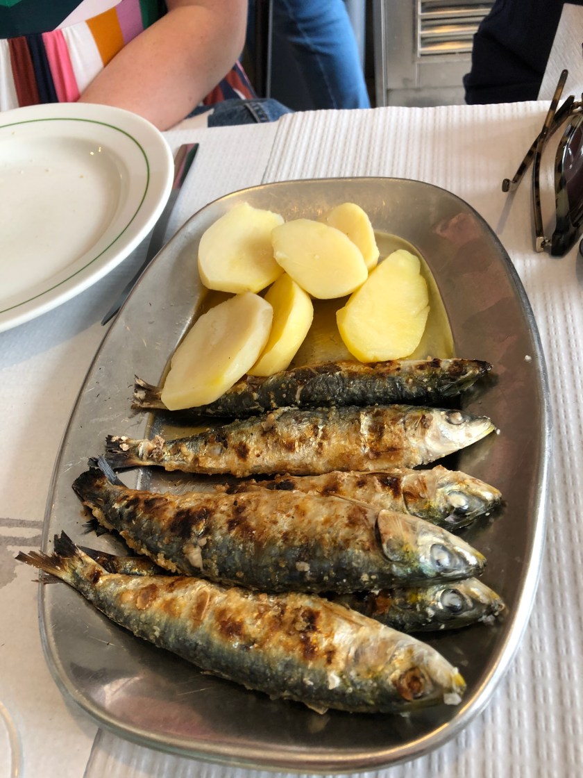 One of these is just a block away from our hotel. We couldn’t resist trying one of the traditional specialties, grilled sardines. They are cooked over coals, head and all, and can be served alone, with bread, or with other grilled fish and meats. The bones are very fine and can be eaten, but I refuse to snack on fish heads!