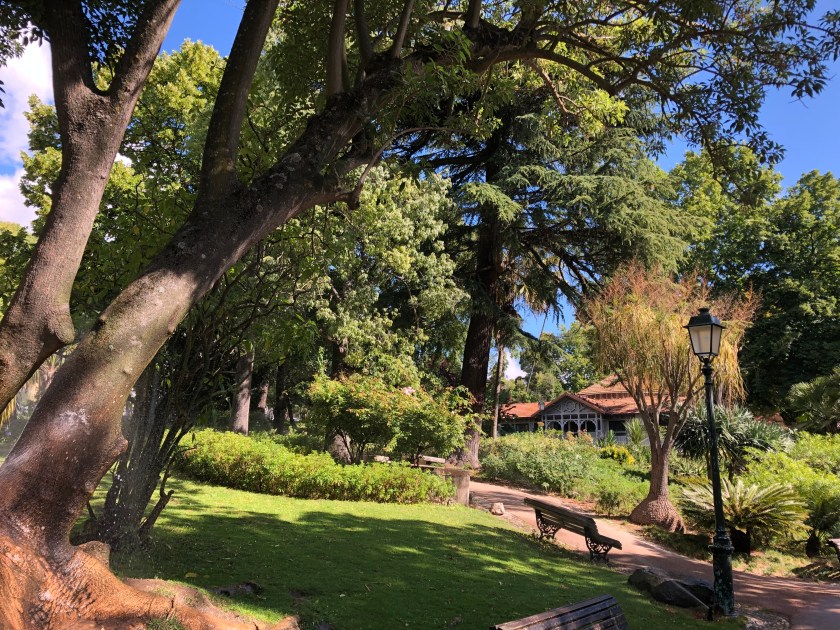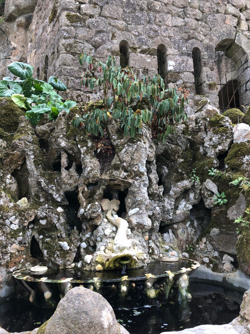 we began the long climb to the Quinta da Regaleira. The mansion and its elaborate gardens were built between 1896 and 1910 by a billionaire, Antonio Carvalho Montero, who made his fortune in Brazil, and designed by an Italian set designer, Luigi Manini, in a weird melange of Manueline, gothic and Renaissance styles. The gardens are magnificent, with waterfalls, exotic plants, tunnels, and a spiral staircase enclosed well that was reportedly used in the initiation rituals of the order of Masons.