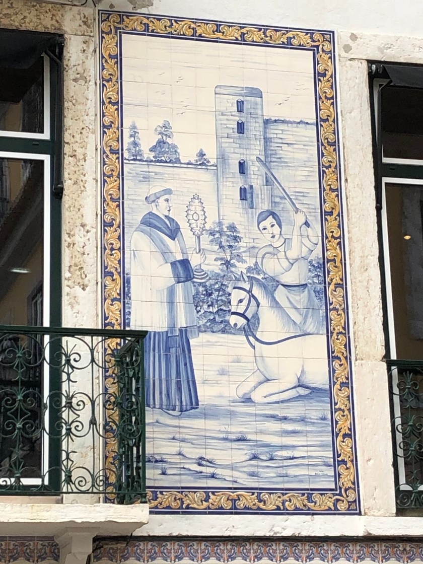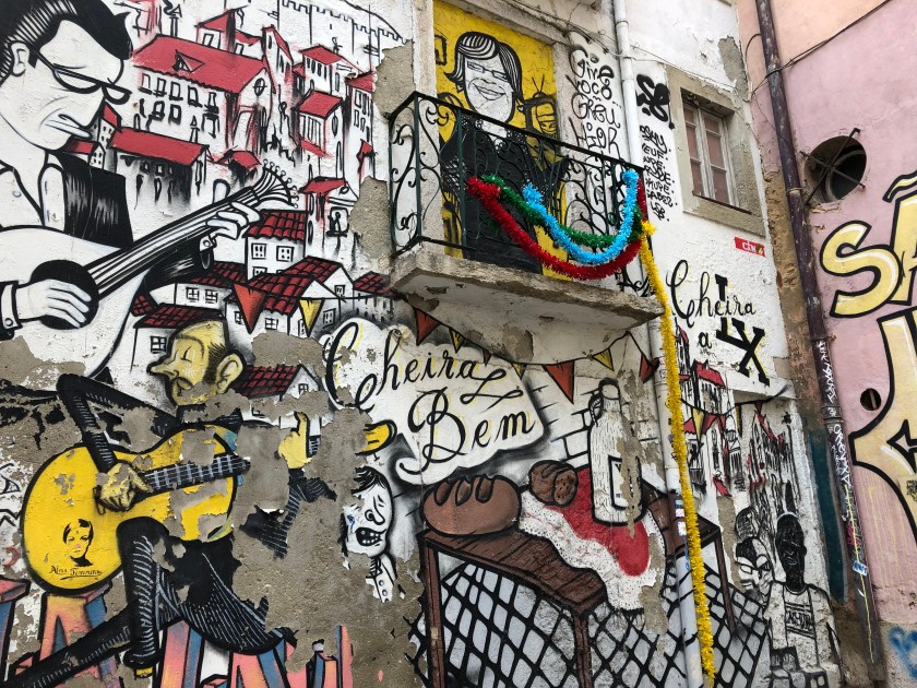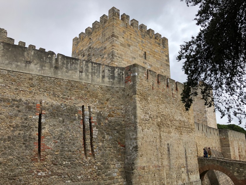 Actually it’s just like every other subway (except for the beautiful tile murals that grace the walls) I’ve used – wave the fare card over the sensor and walk through the open turnstiles! After an introduction to the Rossio and Figueroia plazas, we began our climb up to the Castelo S. Jorge, which has a great view but virtually nothing remaining if the original structure. It was rebuilt in the 1940s by the Salazar government to resemble the original 1500s fortress. With its crenellations it certainly has a Moorish appearance. On the way up the hilly streets and many steps, examples of street art can be seen.