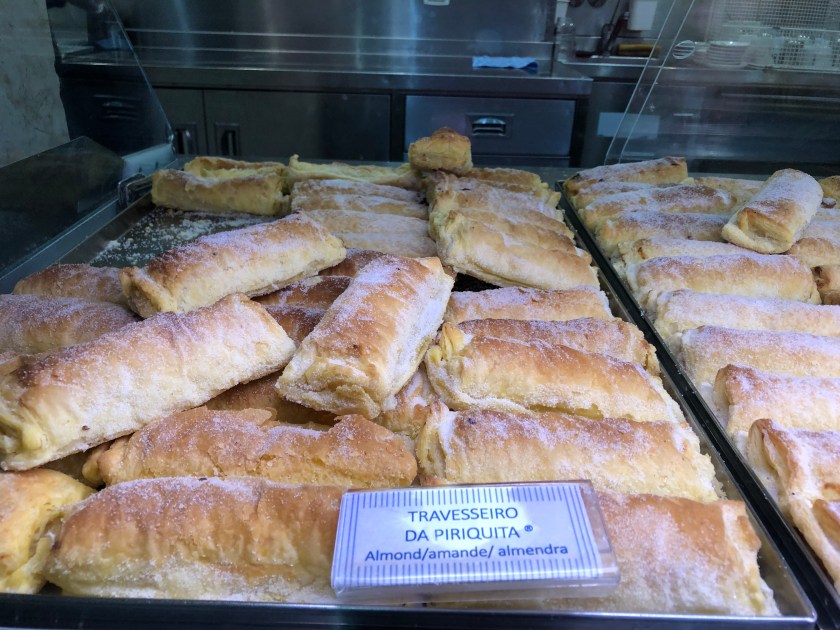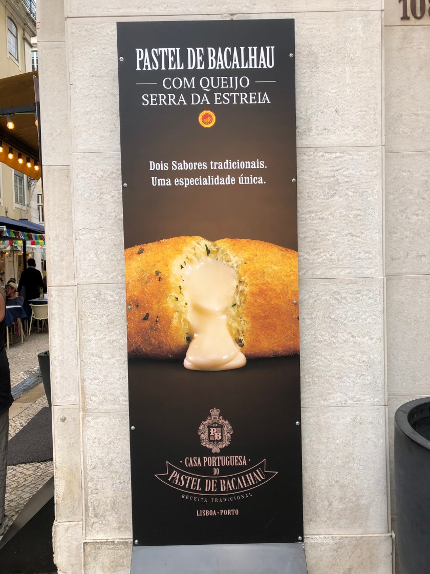 we disembarked near the Rossio train station. Tony was obsessed with sampling the bacalhau (salted codfish) and potato fritter and we still had about an hour before we could pick up our clean laundry. A pitstop at Starbucks (to use the rest room, one needs to purchase an item and then there is a restroom access code on the receipt) was necessary and then he got to try the “interesting” combination of fish, mashed potatoes, and gooey cheese!