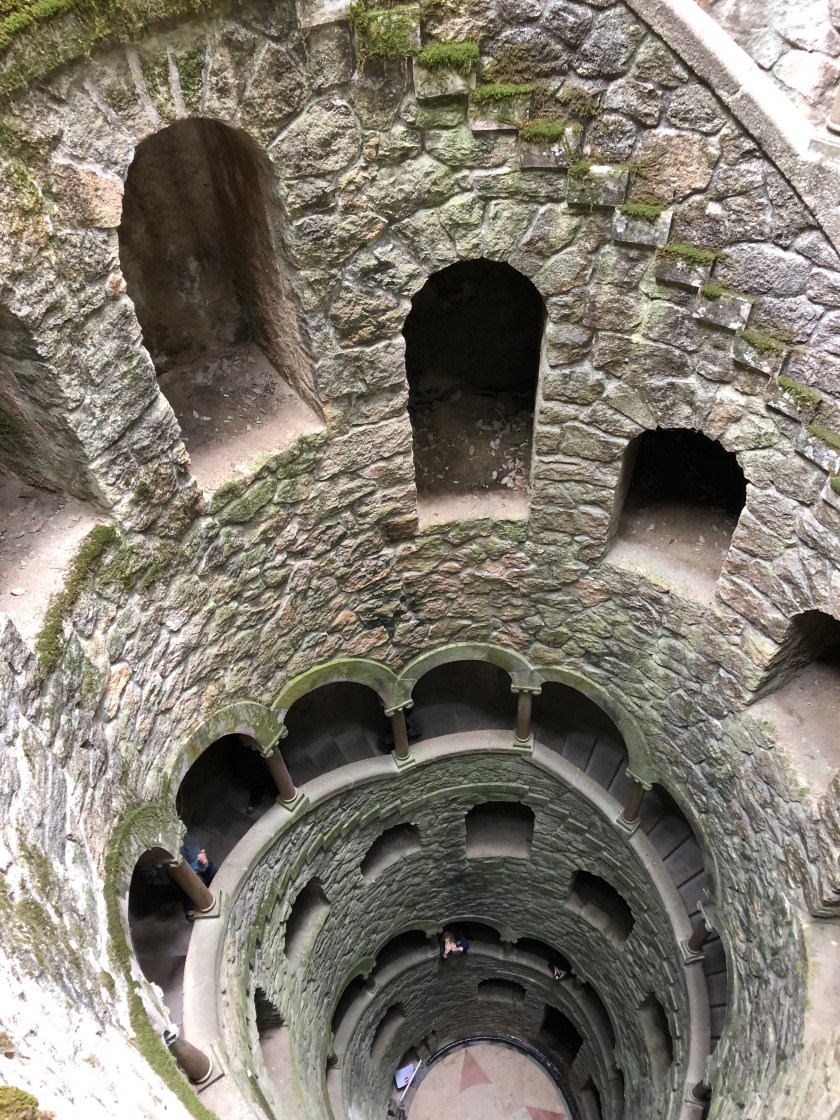 we began the long climb to the Quinta da Regaleira. The mansion and its elaborate gardens were built between 1896 and 1910 by a billionaire, Antonio Carvalho Montero, who made his fortune in Brazil, and designed by an Italian set designer, Luigi Manini, in a weird melange of Manueline, gothic and Renaissance styles. The gardens are magnificent, with waterfalls, exotic plants, tunnels, and a spiral staircase enclosed well that was reportedly used in the initiation rituals of the order of Masons.