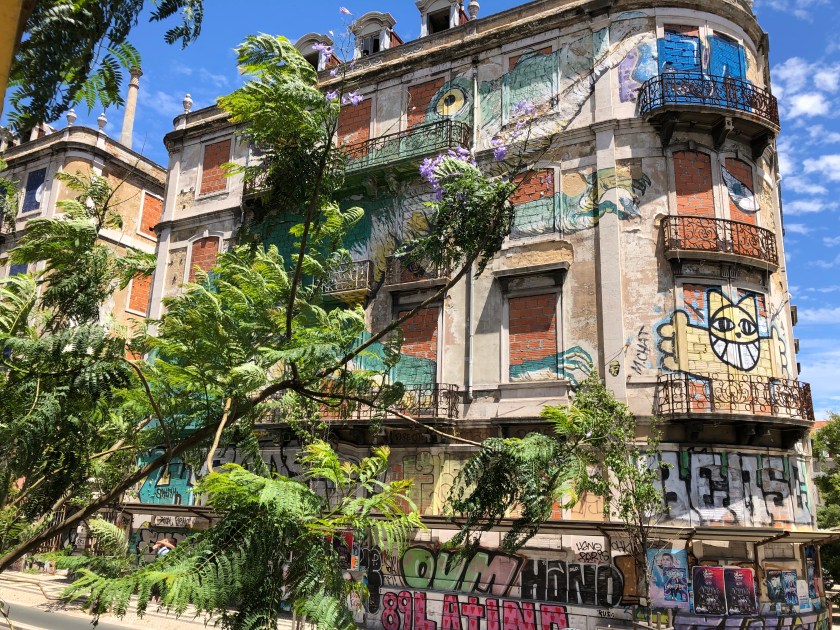 Actually it’s just like every other subway (except for the beautiful tile murals that grace the walls) I’ve used – wave the fare card over the sensor and walk through the open turnstiles! After an introduction to the Rossio and Figueroia plazas, we began our climb up to the Castelo S. Jorge, which has a great view but virtually nothing remaining if the original structure. It was rebuilt in the 1940s by the Salazar government to resemble the original 1500s fortress. With its crenellations it certainly has a Moorish appearance. On the way up the hilly streets and many steps, examples of street art can be seen.